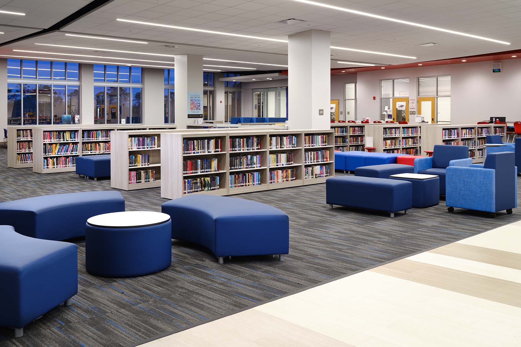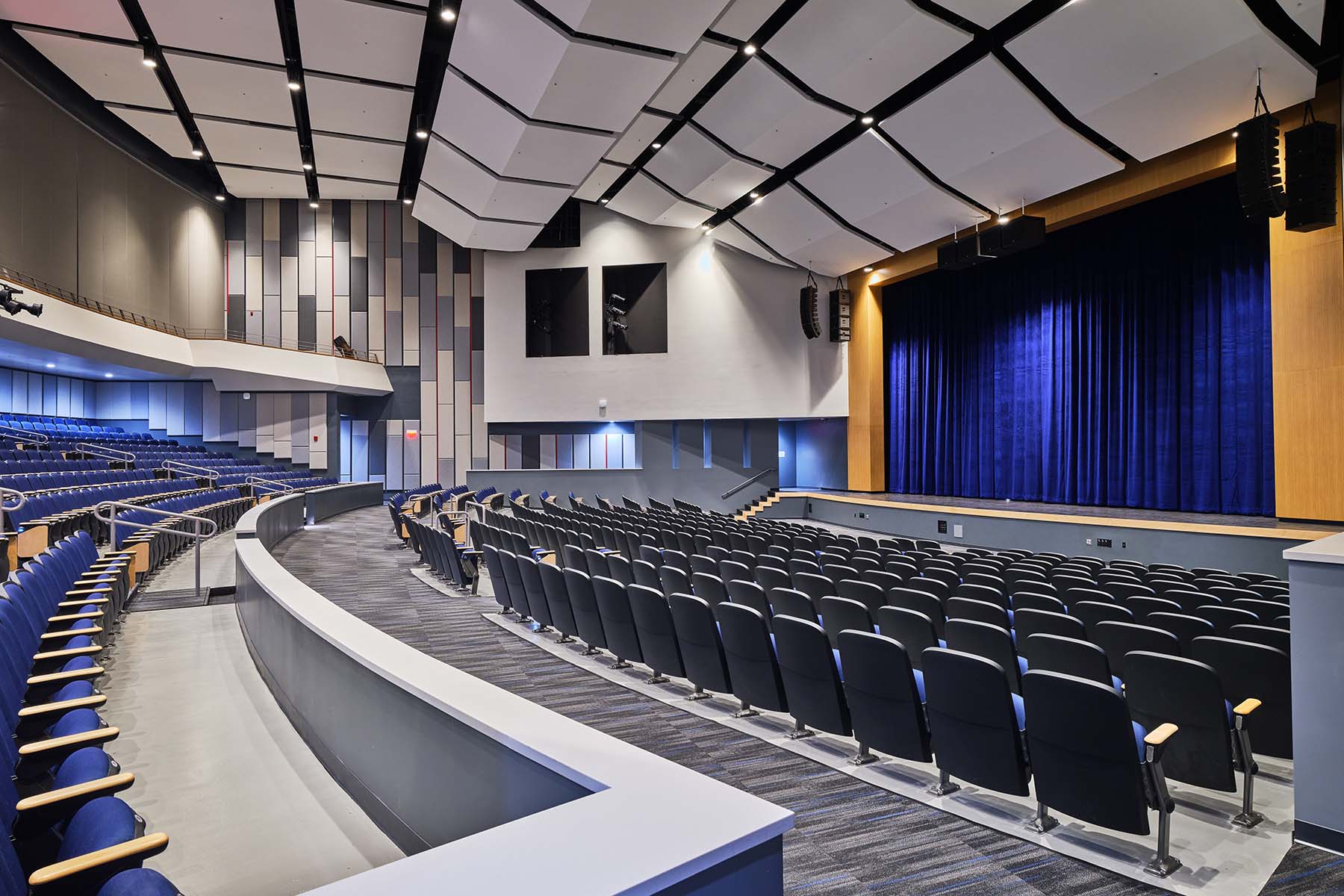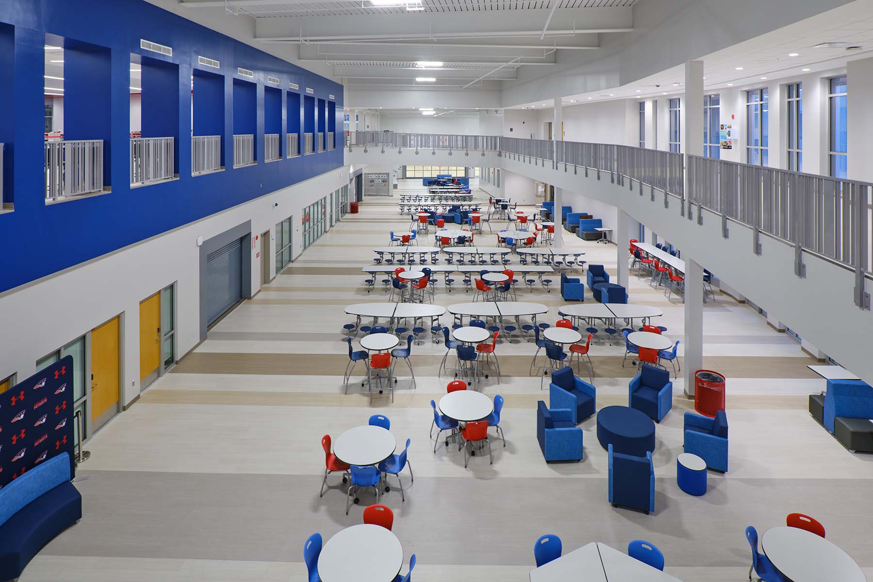 This prototype high school in Collier County is designed to be a state-of-the-art educational facility with the flexibility to quickly adopt ever-changing technology and learning methodologies. The 61-acre site supports a three-story, 246,431-square-foot high school and site buildings designed to serve 2,000 students, and features five career academies: engineering, health science, law studies, information technology, and entrepreneurship and finance. Along with the career academies, classrooms, and labs, the facility features a secured entry for welcoming students, parents, and guests; administrative offices/conference rooms; a central core collaborative dining and gathering space; gymnasiums; and auditorium/performing arts hall. Accompanying academics, the site includes athletic fields/facilities including soccer fields, tennis courts, baseball and softball fields, basketball courts, and football/track and field and stadium.