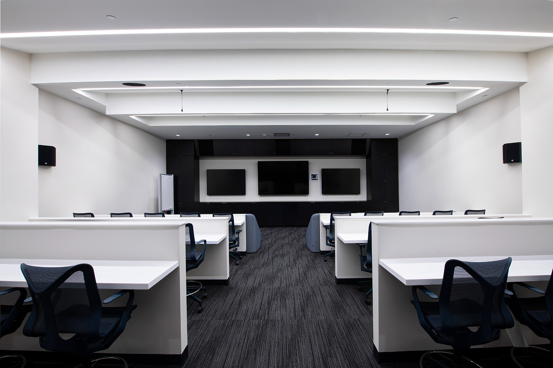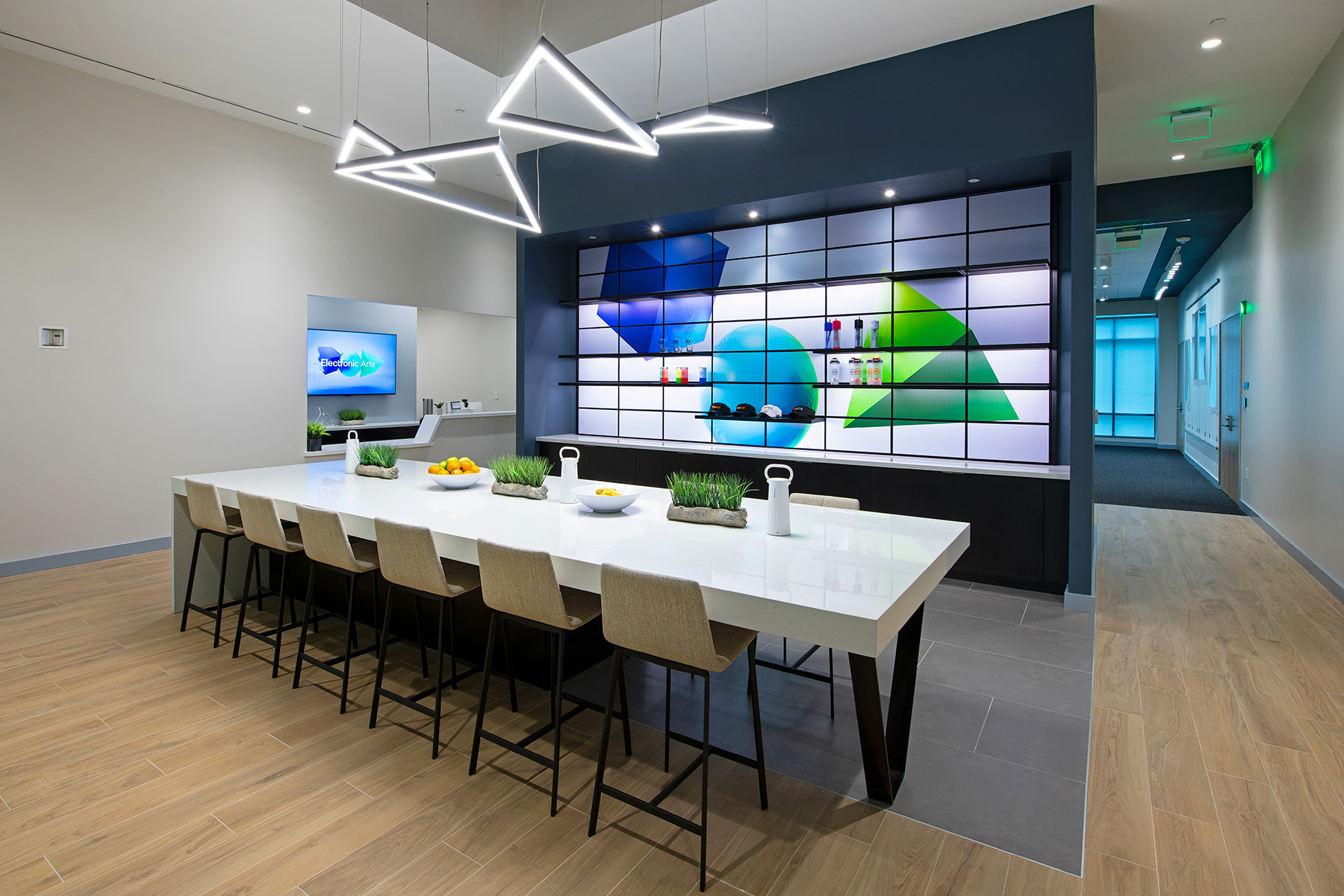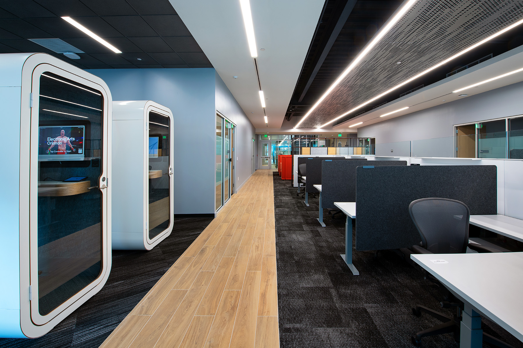 TLC’s designs accommodate the additional power needs for four floors of offices, specialized EA spaces, extensive data equipment rooms, and a first floor kitchen/dining area for employees. Lighting is all LED with a programmable, intelligent building-wide lighting control system that allows for individual control of lights in select areas. HVAC design includes a chilled water system with two rooftop aircooled package chillers, with two chilled water VAV air handling units on each floor. Increased ventilation is planned to improve indoor air quality for occupants and reduce risks of virus transmission through increases air change rates, addressing the current COVID-19 issues. Technology includes a structured cabling system using CAT 6A, fiber optic backbone, wireless network to support wireless access points, Voice Over IP system, and audio/visual system with IP-based distribution and displays.