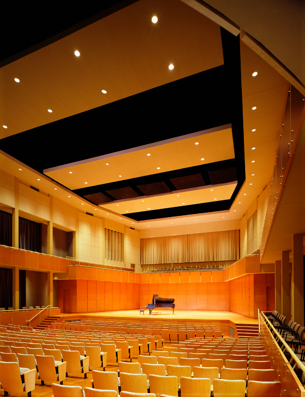 In the concert hall, almost every wall surface is solid masonry construction, and the floor is stained concrete rather than carpet. This helps to create a rich warm sound. The liveliness of the hall can also be “tuned” for different types of performances by opening or closing drapes on the walls and adjusting acoustical “clouds” and panels hanging from the ceiling.