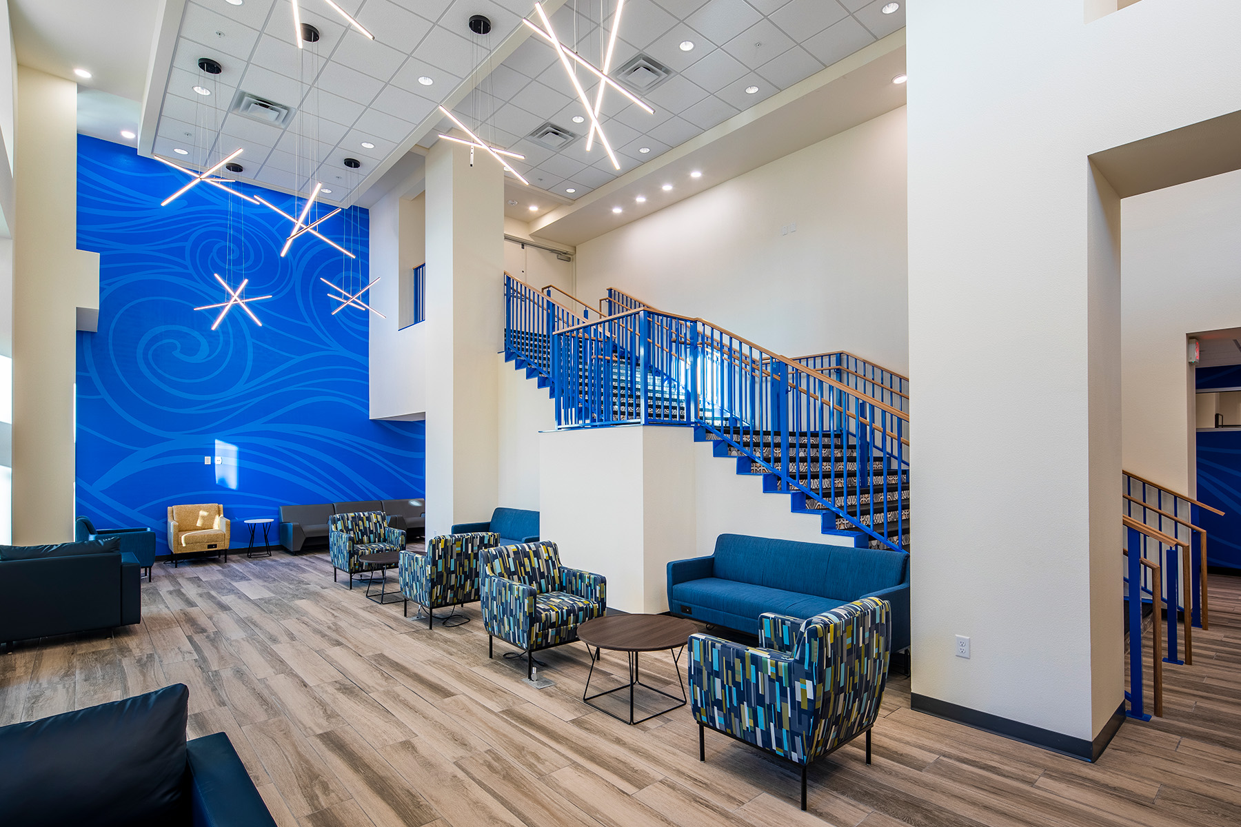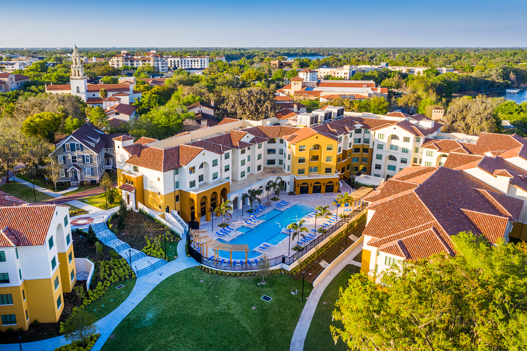 In 2019, Rollins College leveled the former McKean Hall near Lake Virginia to prepare for the new Lakeside Neighborhood student housing complex. This 250,000-square-foot, five-story facility is situated on the southeastern shoreline of the Rollins College campus, with beautiful views of Lake Virginia and easy access to the campus. The dorms are focused on community and wellness, offering students private personal space surrounded by collaborative communal spaces. The complex features a fitness center and movement studio, a market and café, outdoor space, and pool plus offices for some campus organizations like the Office of Residential Life & Explorations and the Center for Inclusion & Campus Involvement.