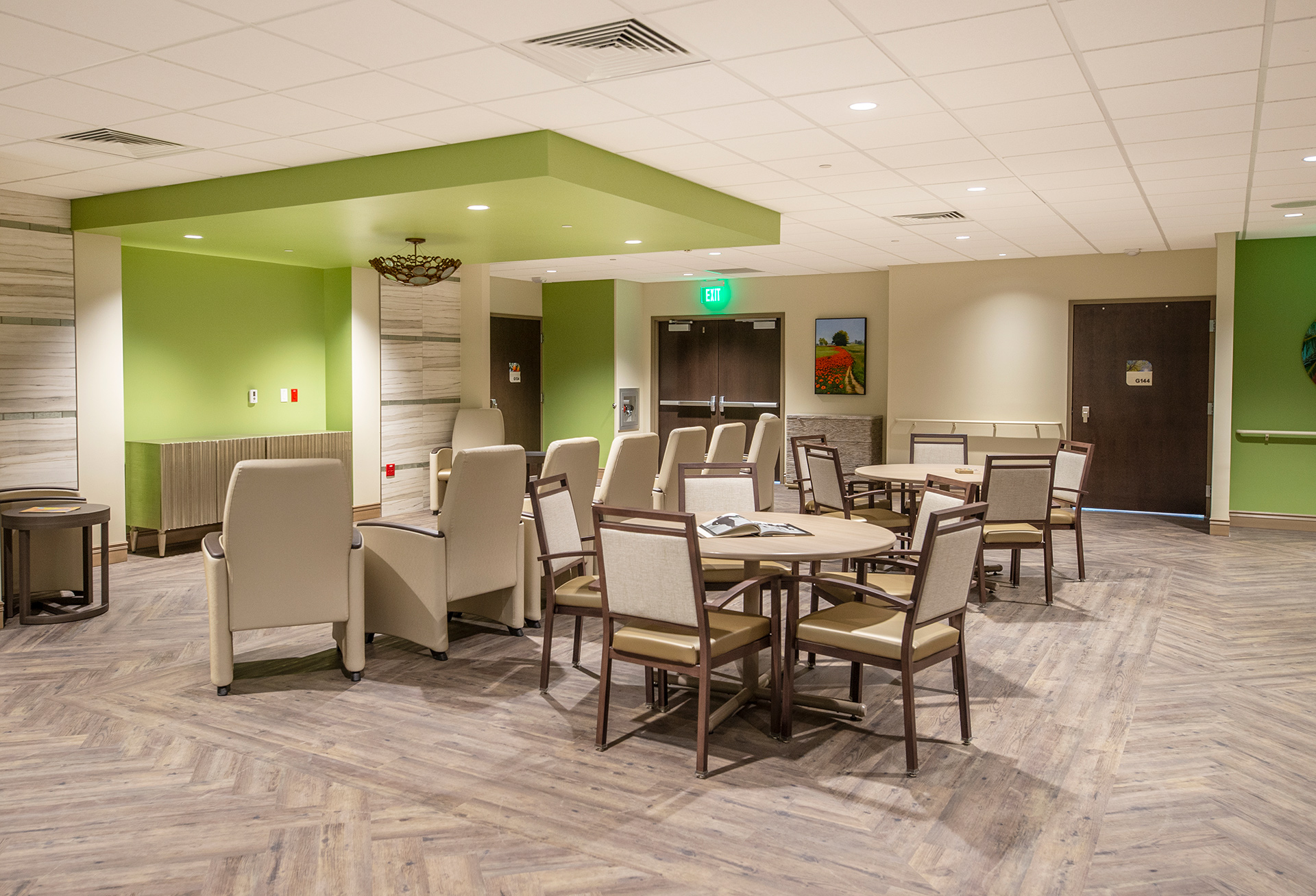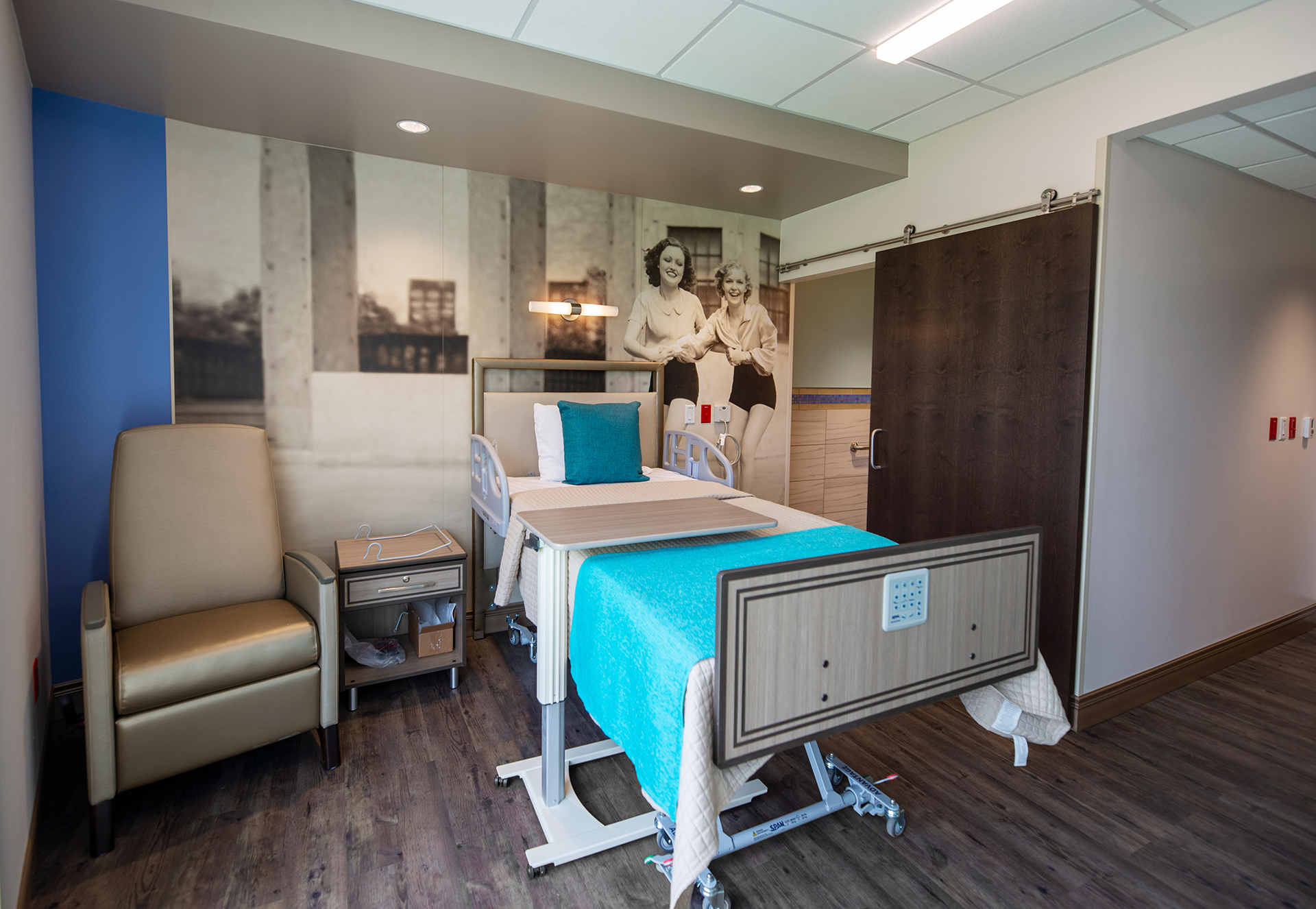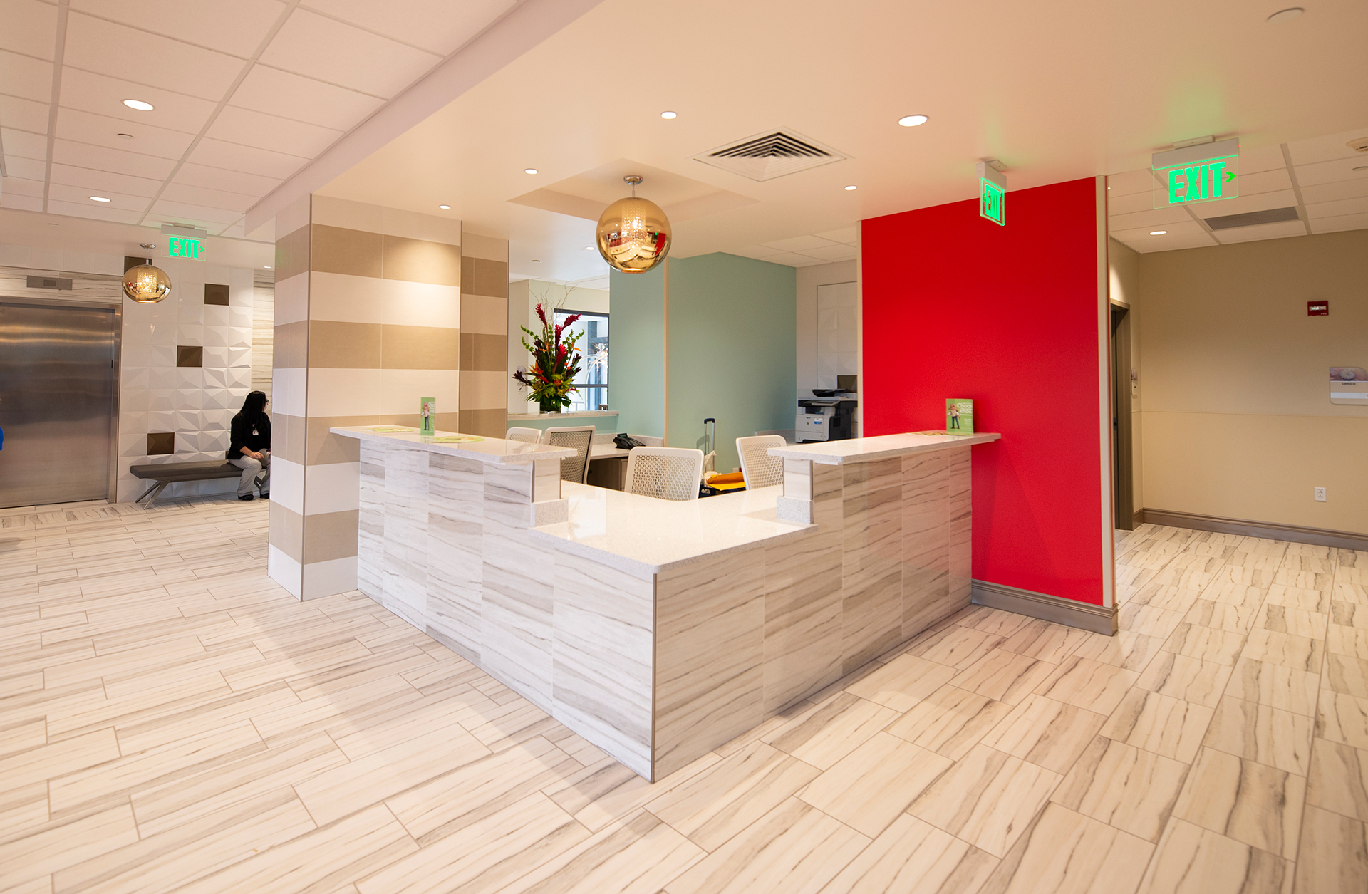 A key focus when designing this rehab center was to create a high quality medical facility that includes as many comforting hotel-like amenities as possible. Luxurious touches include decorative lighting fixtures, stylized bedrooms, and luggage carts in the main lobby.