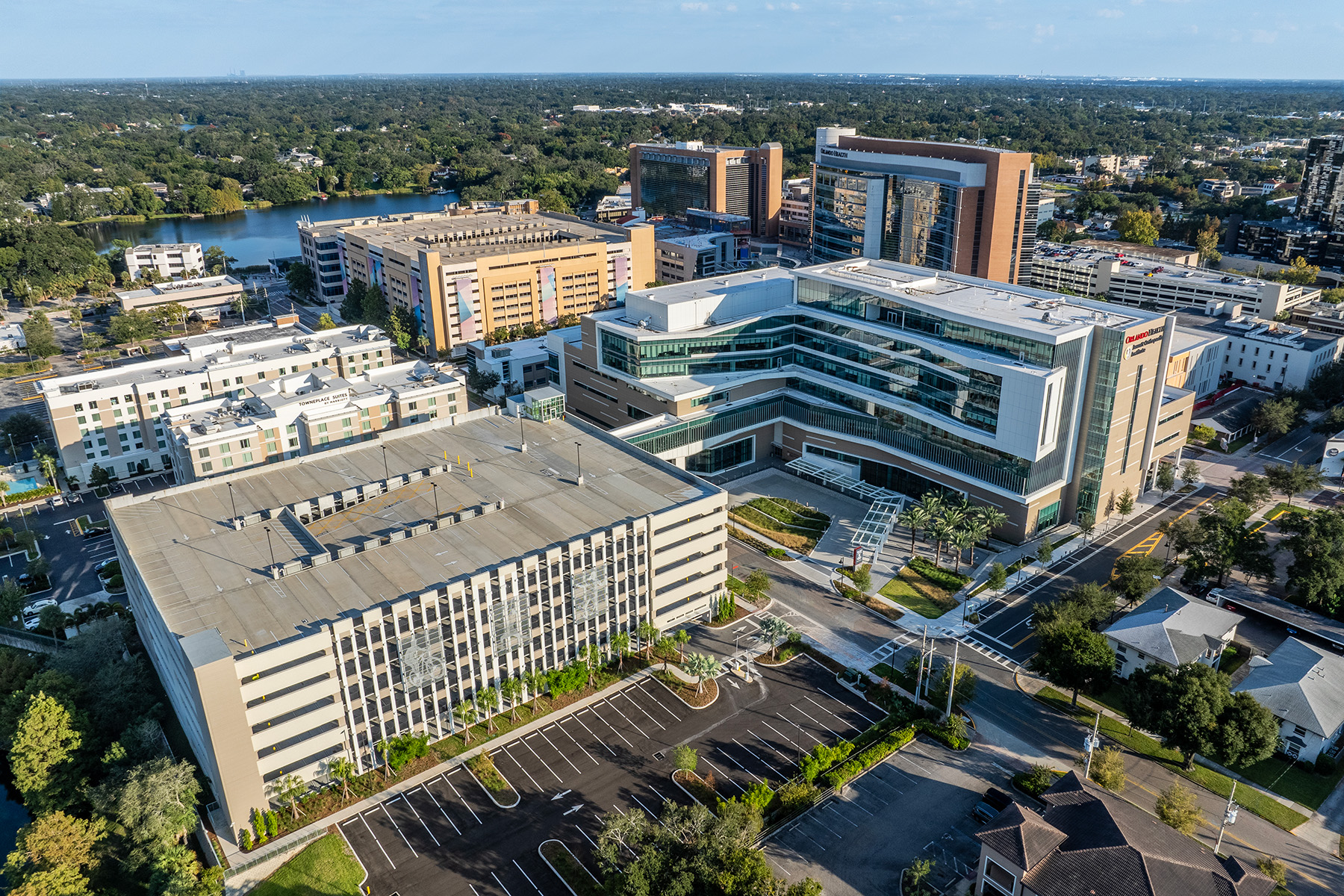 Two pedestrian walkways connect the second floor of the ambulatory surgery center to the parking garage and main Orlando Regional Medical Center.