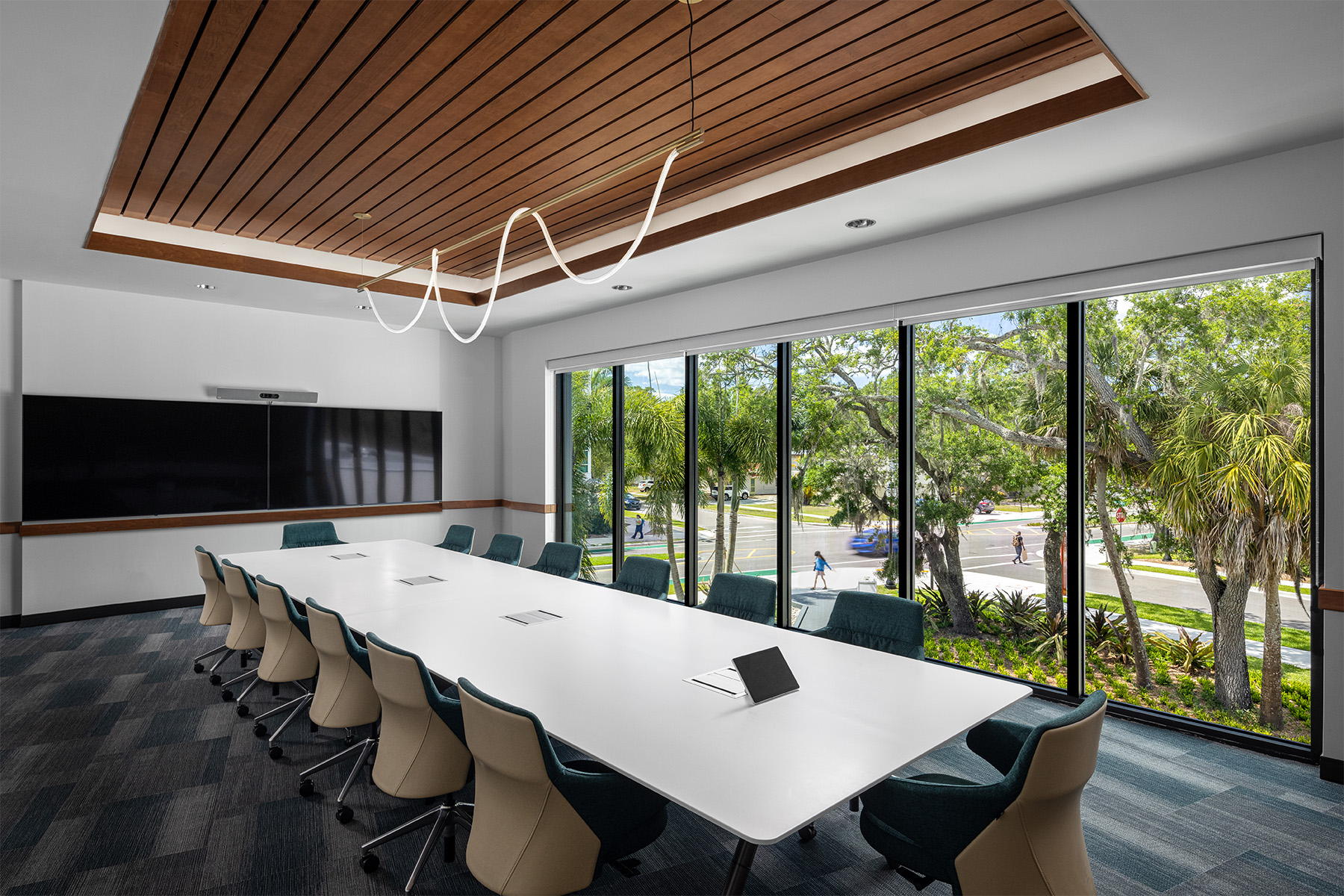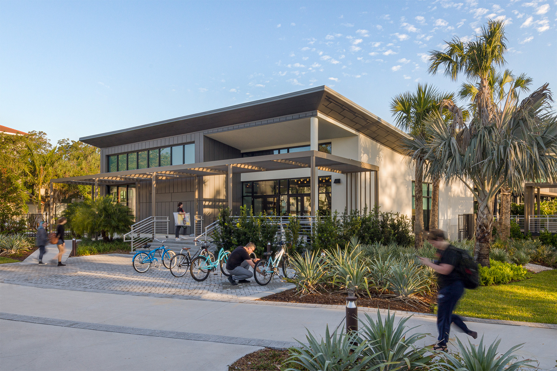 HVAC systems include modular chilled water AHUs with VAV terminals. A dedicated dual-path AHU serves the dining hall along with a dedicated 100% outside air unit that provides preconditioned make-up air to the kitchen hoods. Each of the hoods utilize independent demand control for exhaust / make-up air to optimize system performance and minimize energy costs. Both of the modular AHUs and associated terminal units utilize heating hot water supplied by high-efficiency boilers. The facility uses variable refrigerant flow systems for reservable dining spaces, offices, storage and IT/electrical equipment rooms. The VRF condensing units, as well as the kitchen refrigeration condensing units, are water cooled. Heat is rejected into the chilled water return loop resulting in higher operating efficiencies versus air cooled. The design accommodates the addition of a PV array. TLC’s energy model predicts an energy savings of 23.5% against a baseline building under ASHRAE 90.1-2010, without considering savings from renewable energy sources.