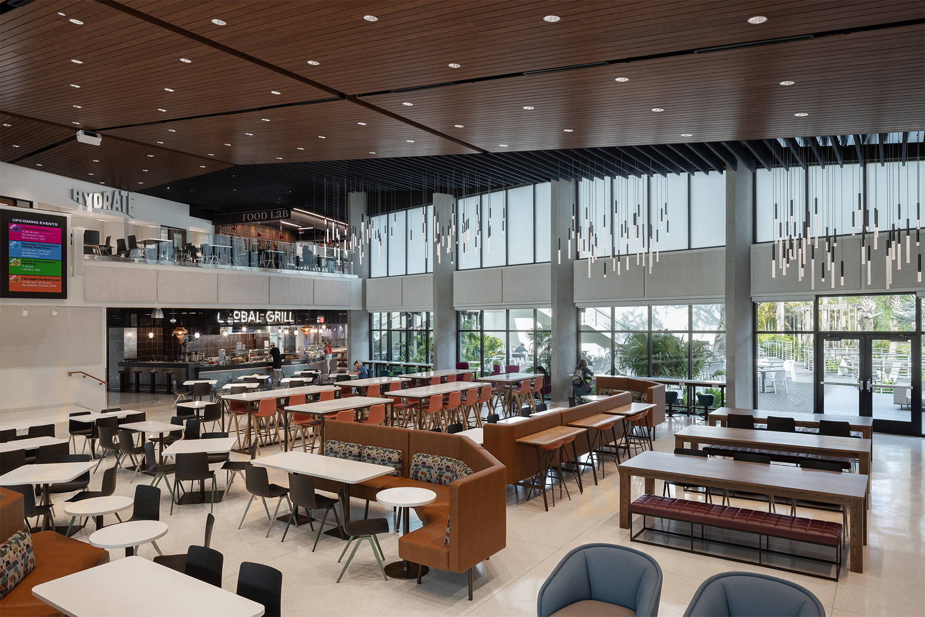 To provide students with dining options, the new Cunniffe Commons is a two-story facility with seating for approximately 550 students inside, as well as outdoor terrace seating for up to 100 students. The facility has a full kitchen and offers a soup island, grille, teaching stations, bakery, deli and stations for vegetarian and allergen-safe diners.