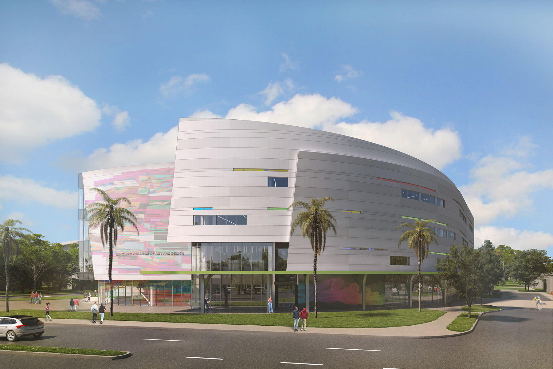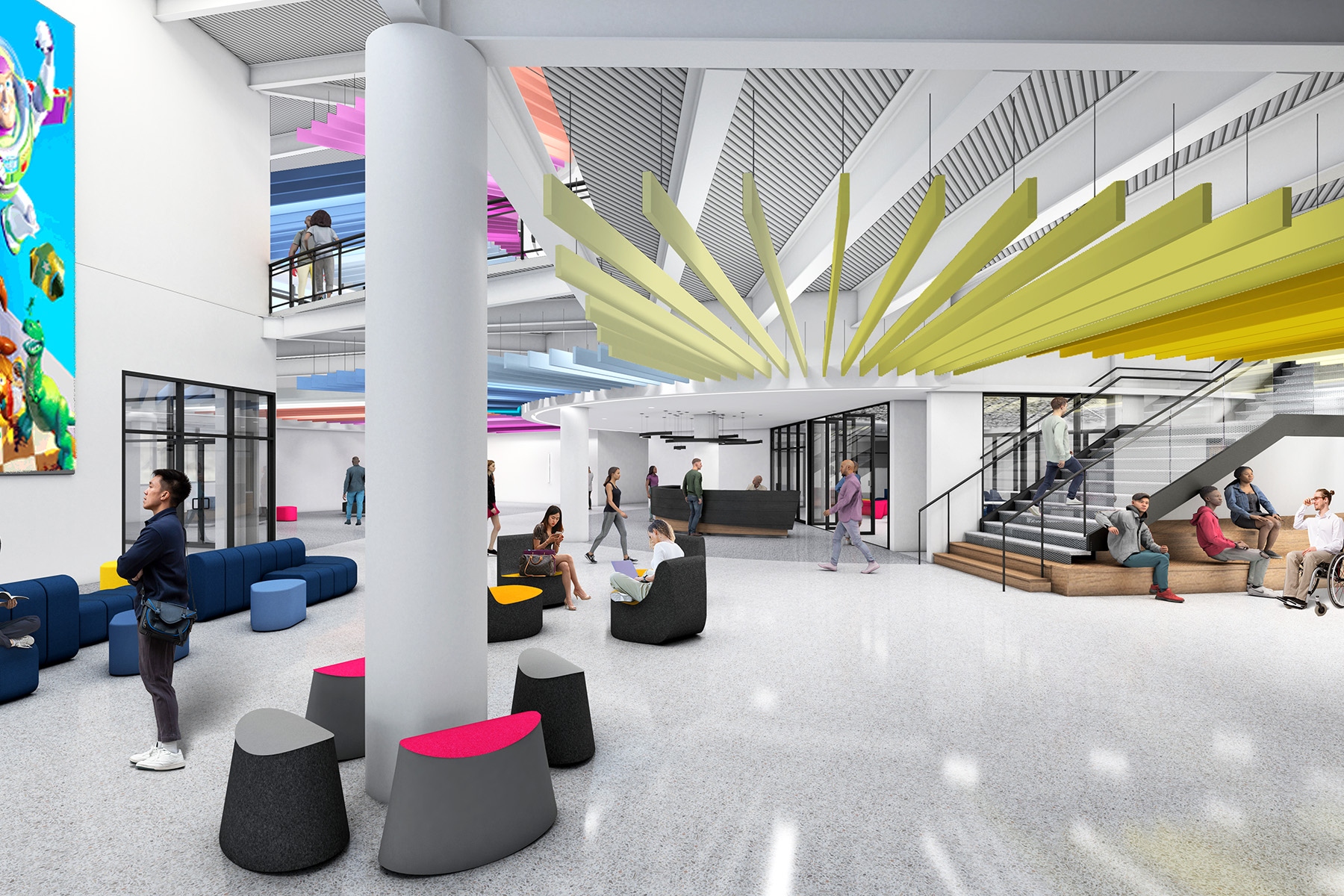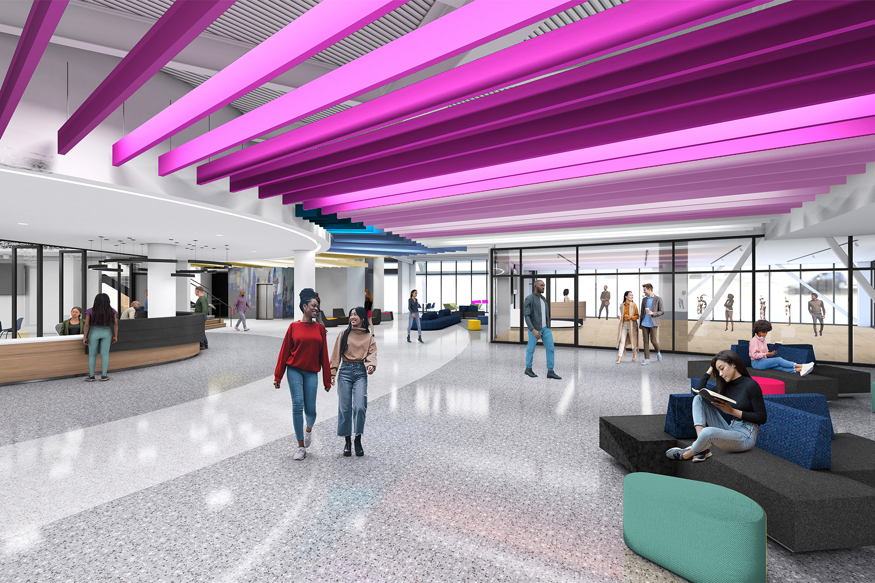 New five-story iconic structure seeking LEED Silver Certification. Designed to create a statement about the institution, this eye-catching structure creates a welcoming presence on campus. The building houses gathering spaces, collaboration spaces, restrooms, and various support areas.