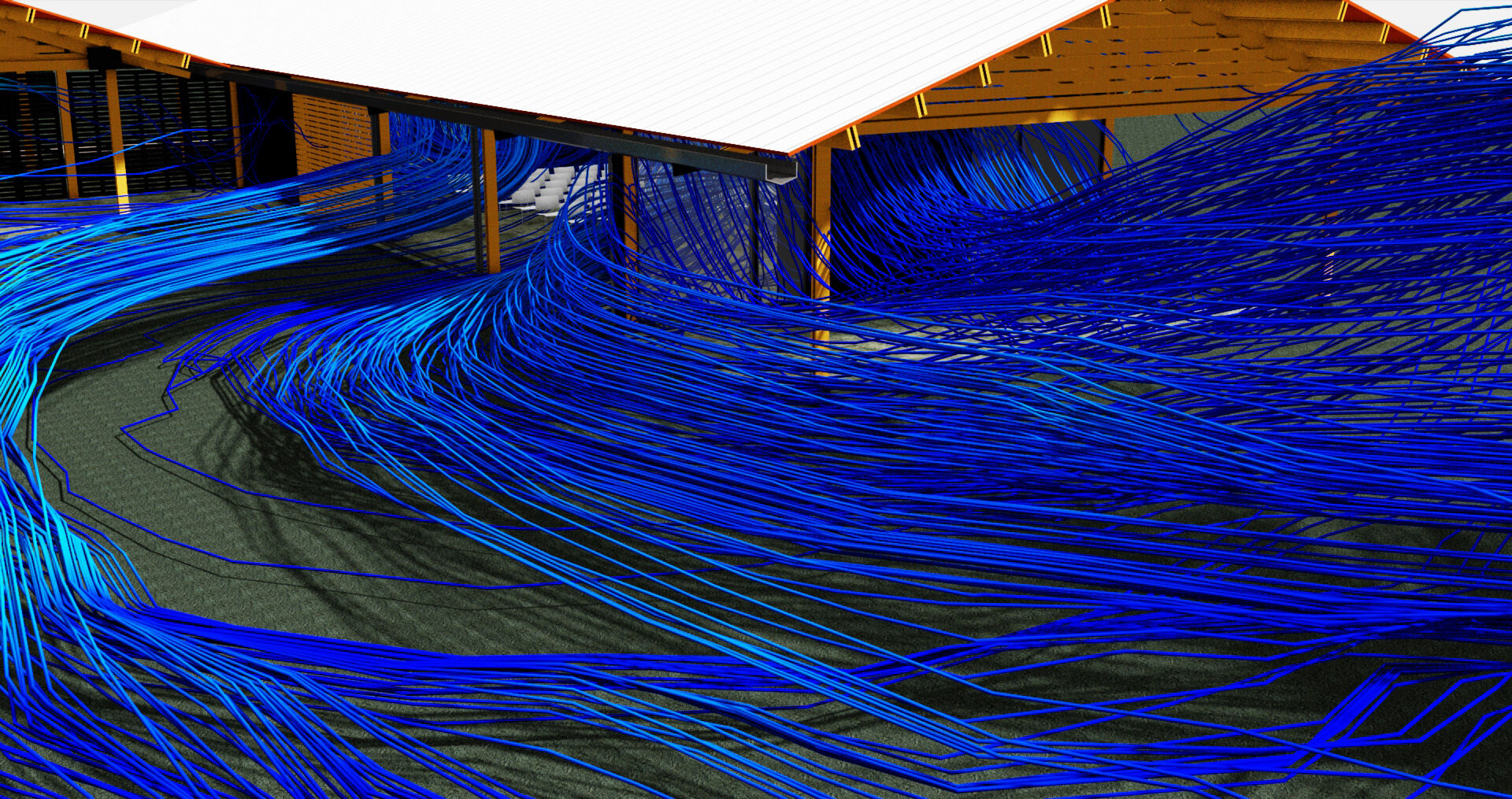 Pavilion for educational and social events demonstrating net zero energy and water performance. Main building houses an open assembly space and the second contains restrooms, storage, warming kitchen and support spaces. Both passive and active sustainability strategies are incorporated into the design, including large ceiling fans, PV array, cistern for rainwater capture and indirect daylighting, shade and orientation of the building.
