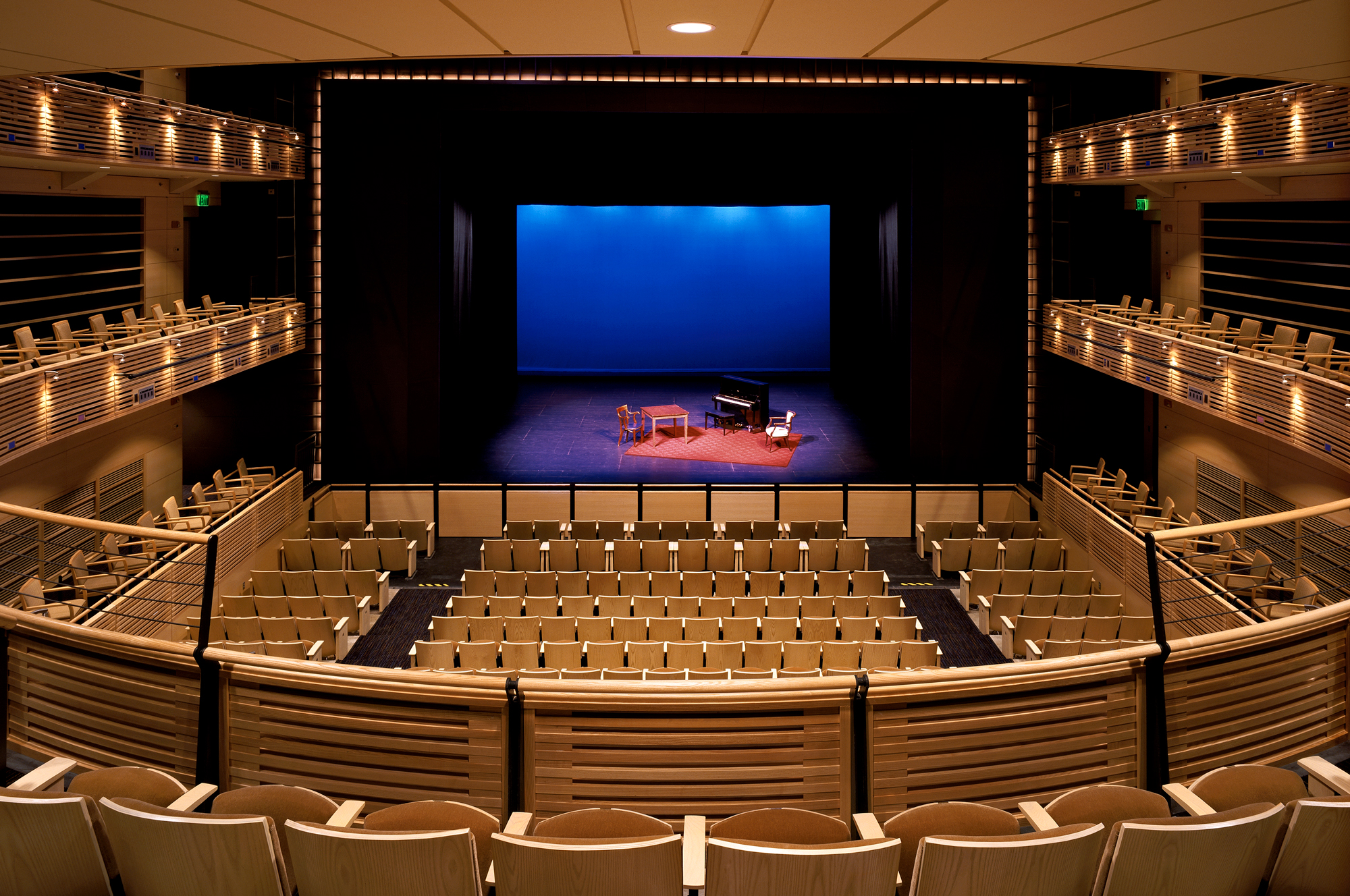 Other facilities include dance rehearsal and performance spaces, a design and media classroom, scenic and wardrobe shops, department offices, and support areas.