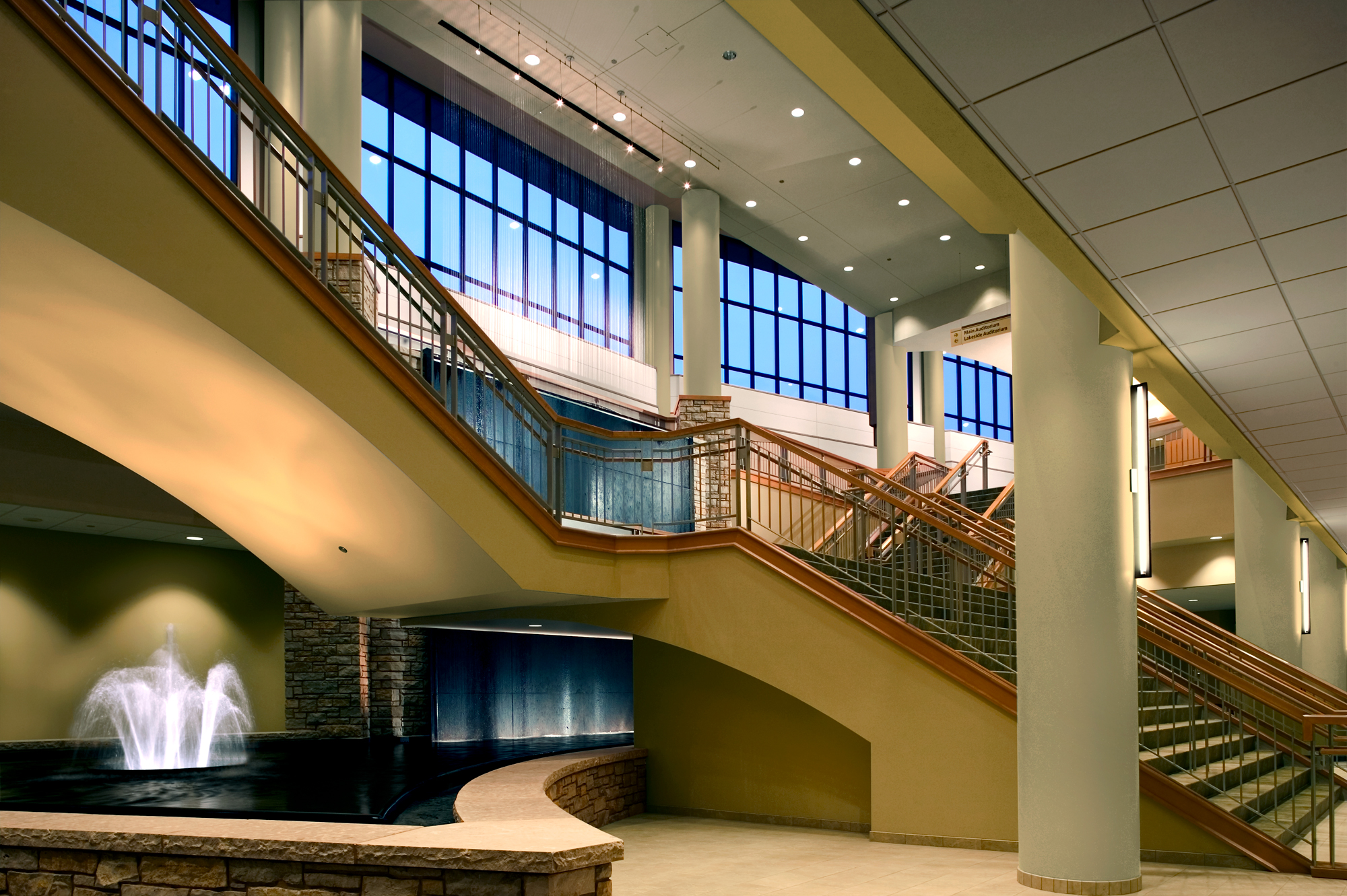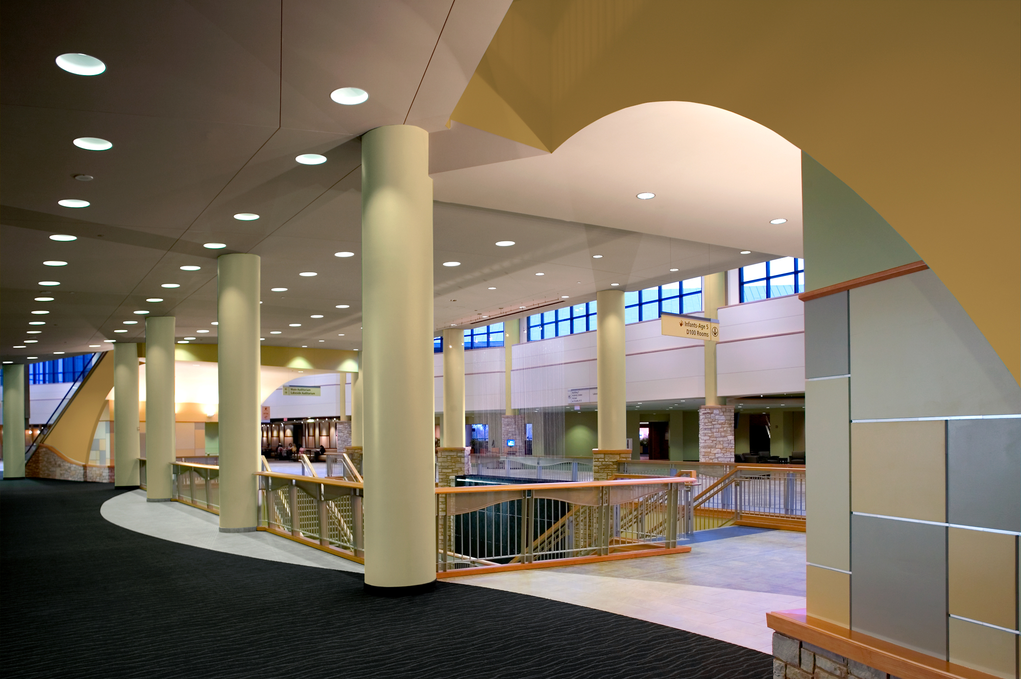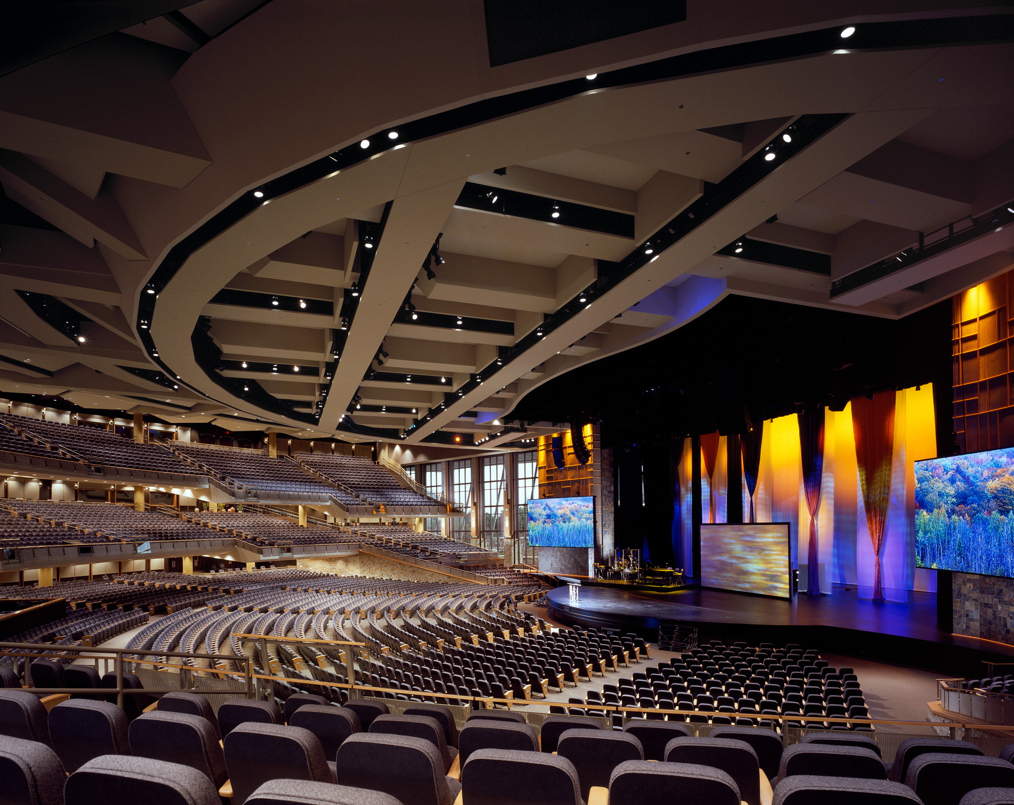 Featuring a generous seating capacity and a stage larger than Radio City Music Hall’s, the auditorium nonetheless enjoys an acoustically intimate environment. The ceiling introduces a rectilinear grid to effectively address acoustic challenges presented by the fan-shaped room and is seamlessly integrated with lighting design. Careful room shaping minimizes the need for absorptive finishes to achieve simultaneously suitable environments for music performance, spoken word intelligibility, and congregational participation. A volume between the ceiling and the roof effectively traps bass frequencies to help accommodate high-power sound reinforcement used in contemporary services while also supporting a simple, low-cost, low-noise air distribution system. Willow Creek is a benchmark in the design of spaces that create and sustain a sense of excitement for parishioners joyfully worshipping together.